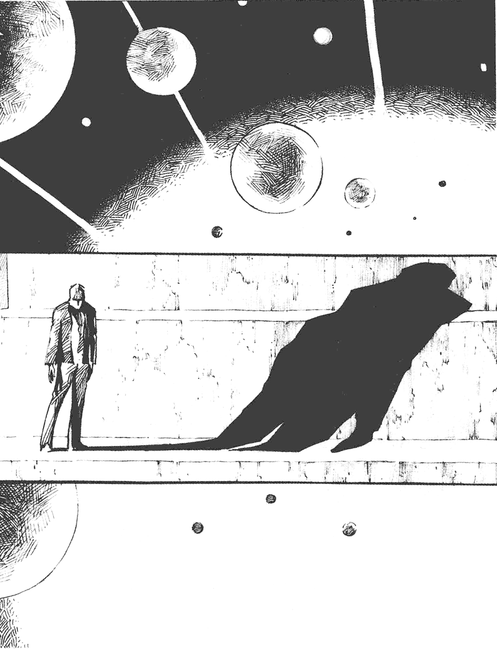 看看吧,这就是虫子,它们的技术与我们的差距,远大于我们与三体文明的差距。人类竭尽全力消灭它们,用尽各种毒剂,用飞机喷洒,引进和培养它们的天敌,搜寻并毁掉它们的卵,用基因改造使它们绝育;用火烧它们,用水淹它们,每个家庭都有对付它们的灭害灵,每个办公桌下都有像苍蝇拍这种击杀它们的武器……这场漫长的战争伴随着整个人类文明,现在仍然胜负未定,虫子并没有被灭绝,它们照样傲行于天地之间,它们的数量也并不比人类出现前少。把人类看作虫子的三体人似乎忘记了一个事实;虫子从来就没有被真正战胜过。太阳被一小片黑云遮住了,在大地上投下一团移动的阴影。这不是普遍的云,是刚刚到来的一大群蝗虫,它们很快开始在附近的田野上降落,三个人沐浴在生命的暴雨之中,感受着地球生命的尊严。丁仪和江森把手中拎着的两瓶酒徐徐洒到脚下的华北平原上,这是敬虫子的。